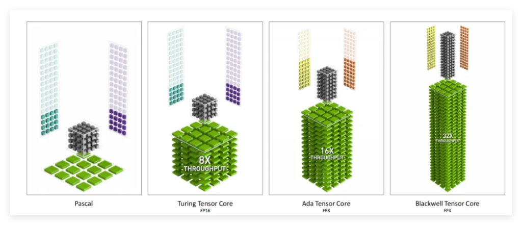 | FP4 Tensor Core | 支持 FP4 精度张量运算,吞吐量比 H100 的 FP8 提升 32 倍 | 大幅降低 AI 推理能耗,使本地运行复杂神经渲染模型成为可能 |